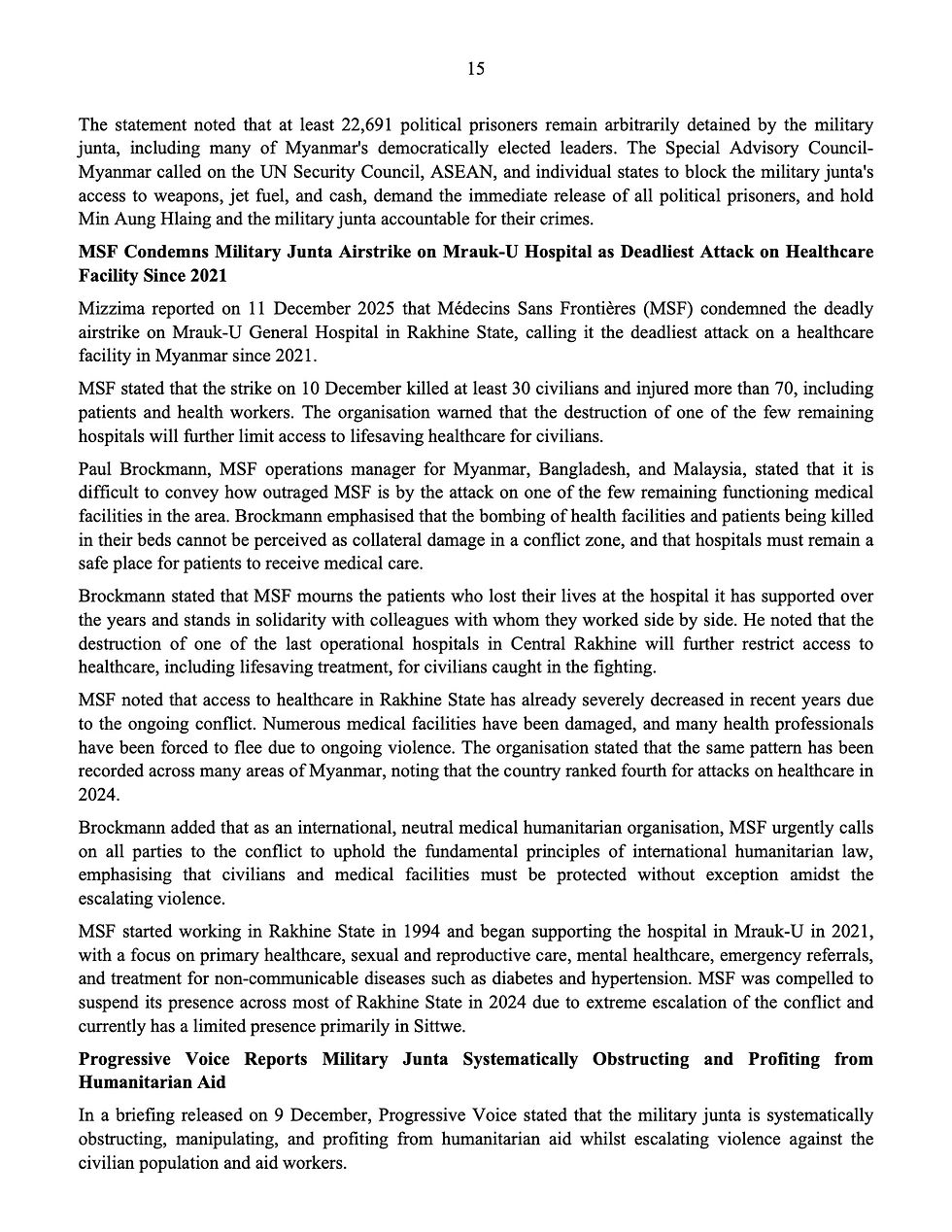 Mizzima reported on 11 December 2025 that Médecins Sans Frontières (MSF) condemned the deadly airstrike on Mrauk-U General Hospital in Rakhine State, calling it the deadliest attack on a healthcare facility in Myanmar since 2021.